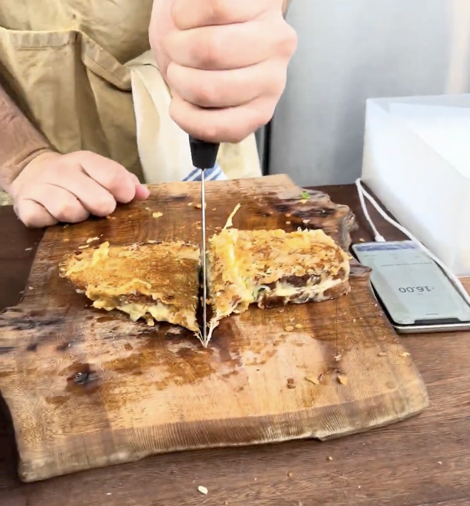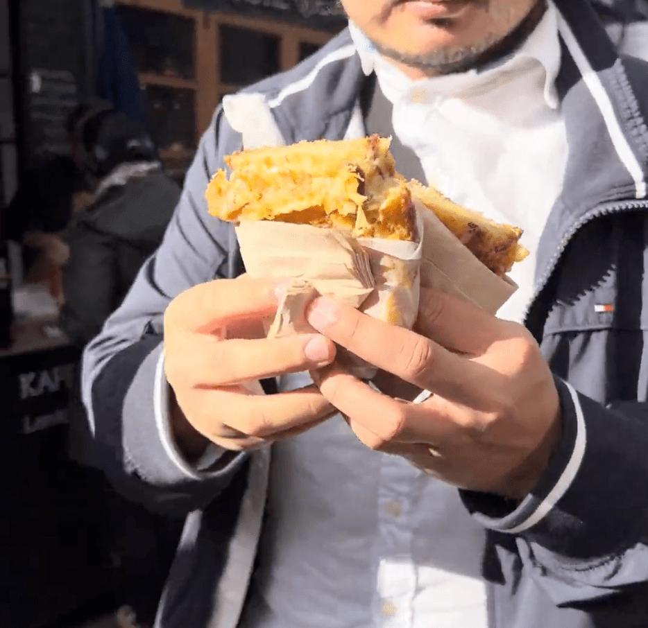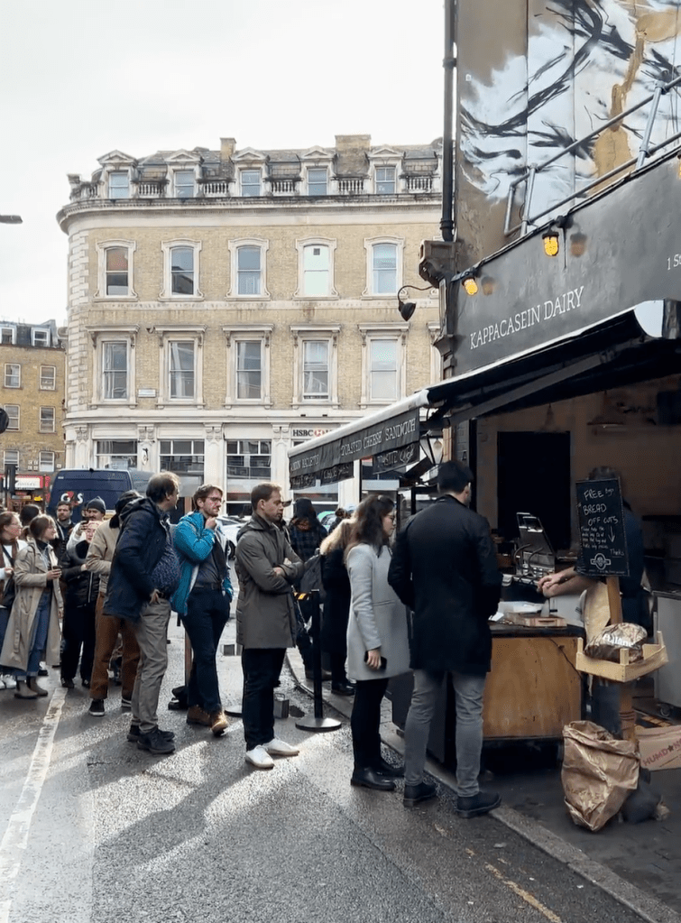 After a 20-minute wait, we got to order. The choices? Raclette or a toastie, and we chose the latter. Later we learned that these are two of the most famous and irresistible street food options in London (hence the long line).
