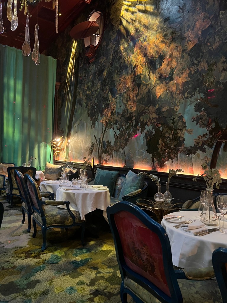 After that very brief test of patience, we finally ascended the short flight of stairs and turned into what I think is the most enchanting space in Sketch—the Glade. Officially described as “an artwork in decoupage; a landscape forest inspired by a 1900’s greeting card,” I’m not even gonna try coming up with something better. That’s exactly what it felt like walking in. It was cozy, whimsical, and dreamy all at once.
