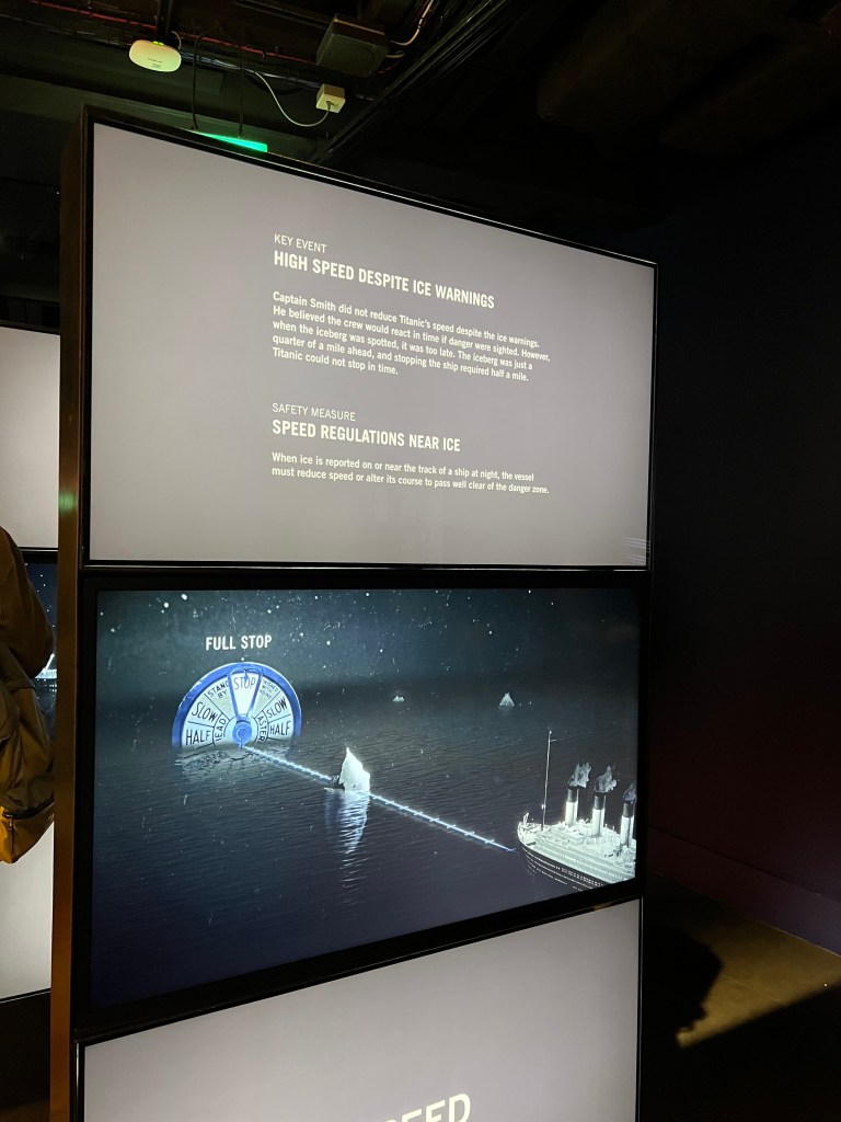 The museum doesn’t linger too long in fine dining and thick mattresses. The next galleries pull you straight into the night of April 14, 1912, when warnings about icebergs had already been sent, yet the Titanic pressed forward at speed.
