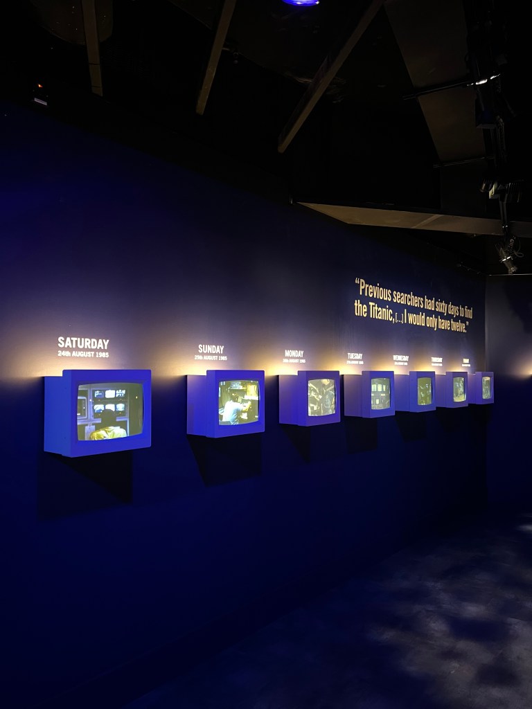 At the center, a model of the Titanic turns slowly while water ripples across the walls, all set to this ethereal music that makes it feel like you’re peering at the ship in its forever home beneath the sea.
